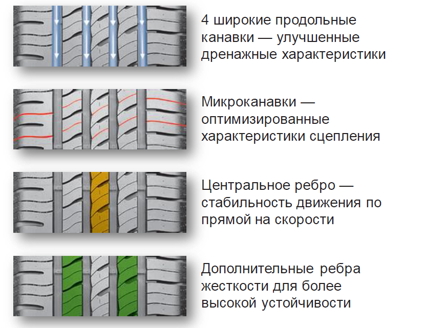 - Глубокие продольные канавки и сеть поперечных каналов быстро отводят воду из пятна контакта. Благодаря этому повышается устойчивость автомобиля на мокрой дороге и снижается риск потери контроля во время дождя.