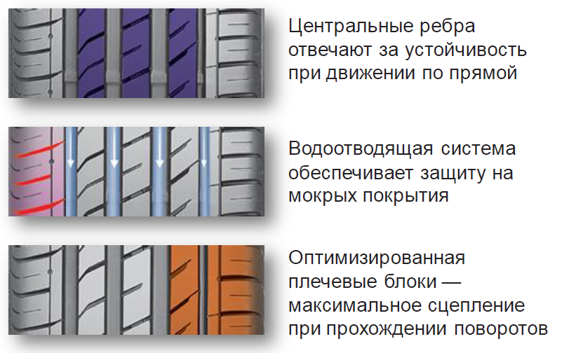 - Курсовая устойчивость — сплошное строение и жёсткая структура продольных рёбер в центральной части асимметричного протектора обеспечивают стабильное прямолинейное движение на загородных трассах.